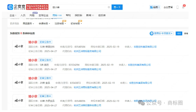 在这样的关键时刻,娃哈哈申请“娃小宗”商标,今年2月19日,宏胜饮料集团有限公司出手申请了“娃小宗”商标,国际分类涵盖了第5类医药、第29类食品、第30类方便食品以及第32类啤酒饮料。