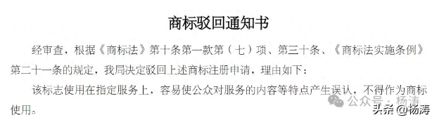《商标法》这一条是“带有欺骗性,容易使公众对商品的质量等特点或者产地产生误认的”,平常遇到以误认驳回的商标名称,大多数原因为里面含有功能或效果方面的词了,让公众对服务内容产生误认。