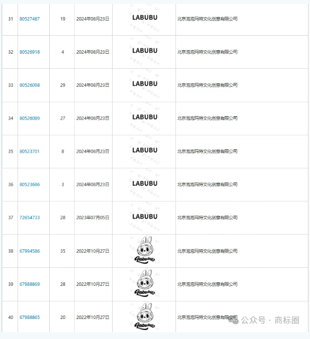 不仅商标数量多,在商标布局上,泡泡玛特对每个 IP 都进行了全方位的商标注册,比如近期爆火的“labubu”,不仅注册了核心的第 28 类玩具商标,和其他相关类别上的防御性注册,如第 16 类文具、第 35 类广告销售、第 41 类教育娱乐等,甚至连文字和图片都进行了全品类商标注册,这也在一定程度上杜绝了其他主体蹭名牌的可能。