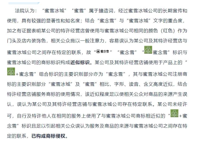 法院认为“蜜雪冰城”“蜜雪”属于臆造词,经过蜜雪冰城公司的长期宣传和使用,具有较强的显著性和知名度;结合“蜜念雪”与“蜜雪冰城”文字的重合度,加之有证据表明内蒙古蜜念雪的特许经营店曾使用与蜜雪冰城公司相同的颜色(红色)作为门头及店内装饰色,相关公众施以一般注意力,容易误认为内蒙古蜜念雪及其特许经营店与蜜雪冰城公司之间存在特定的联系,故“蜜念雪”标识与蜜雪冰城公司的商标标识构成近似标识。