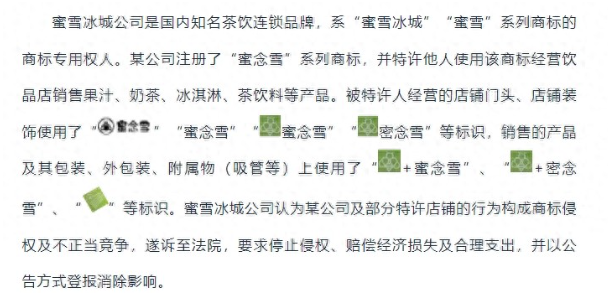 蜜雪冰城公司认为内蒙古蜜念雪及部分特许店铺的行为构成商标侵权及不正当竞争,遂诉至法院,要求停止侵权、赔偿经济损失及合理支出,并以公告方式登报消除影响。