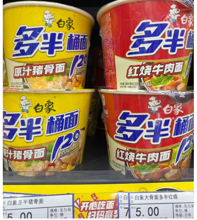 在实测中,记者看到,白象桶装面的外包装上写着“多半”,右上角是一个“R”,“R”标是指注册过的商标。包装显示,面饼重量显示为110g。据白象公司发布的声明,“多半”是基于原70克面饼基础上推出的110-120克面饼的大分量产品。“多一半”是基于原60克面饼推出的100克面饼的产品。白象表示,“后续我公司将尽快调整‘多半’产品包装,避免引发消费者的误解”。