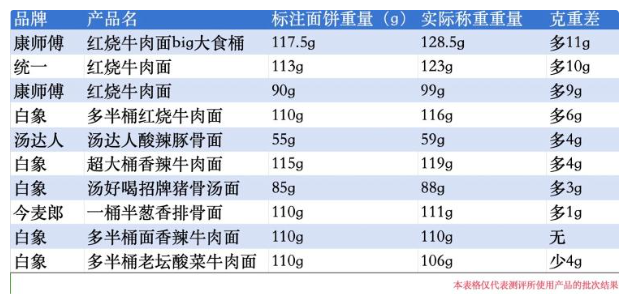 记者分别称重了十款方便面面饼的重量,发现均比标注重量要大。比如白象多半的桶面,包装上显示面饼为110g,实际称重重量为116g;白象的“超大桶”,标称面饼115g,实际为119g;今麦郎“一桶半”面饼包装显示为110g,实际重量为111g,虽比标称的重,但未达到“一桶半”字面意思的127.5 g。其中,白象多半桶老坛酸菜牛肉面包装标称面饼为110g,实际称重为106g。
