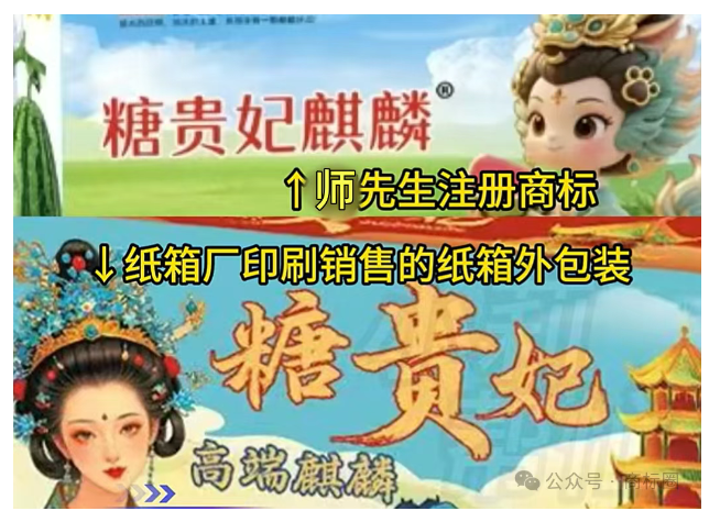 近日,师先生称在市面上发现有人销售麒麟西瓜,外包装与他注册的商标很接近。于是自己调查了半个月,往返多个城市找到了纸箱的生产商。师先生作为“糖贵妃麒麟”商标的持有人,坚持认为对方纸箱厂生产的“糖贵妃高端麒麟”的产品存在侵权。