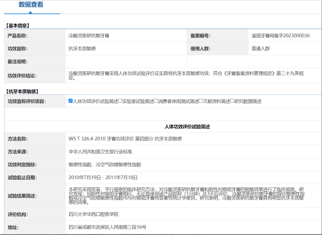 在该产品功效宣称页面,报告显示:“无论是使用该产品即刻(1分钟)及3天后评价,冷酸灵医研抗敏牙膏的探诊敏感性指数或冷空气吹喷敏感性指数均与对照组牙膏有显著性统计学差异。研究表明,冷酸灵医研抗敏牙膏具有明显抗牙本质敏感的效果。”结论显示,产品符合《牙膏备案资料管理规定》第二十九条规定。