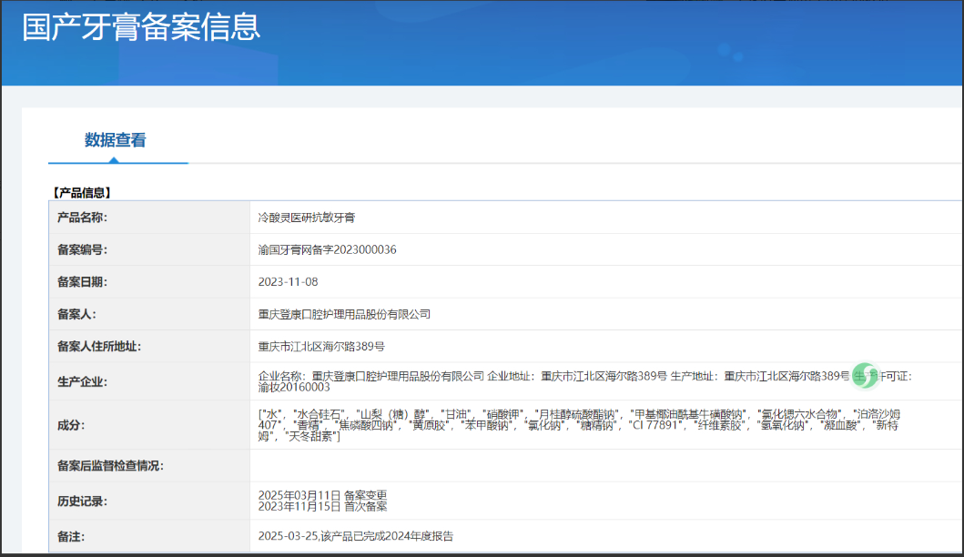 新黄河记者随即登录该平台官网搜索“冷酸灵医研抗敏牙膏”关键词发现,信息备案人为:重庆登康口腔护理用品股份有限公司,2023年11月15日首次备案。