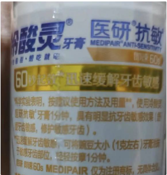 新黄河记者在电商平台“冷酸灵官方旗舰店”看到,在“医研抗敏即速60s牙膏”产品包装上,相关介绍称:“科学表明,按建议使用方法及用量,使用冷酸灵医研抗敏牙膏(天然薄荷)1分钟,具有明显抗牙齿敏感效果(舒缓牙齿敏感,修护敏感牙齿)。”在这段文字下方,另有一行写明:“医研、即速60s、MEDIPAIR仅为注册商标,无具体含义。”