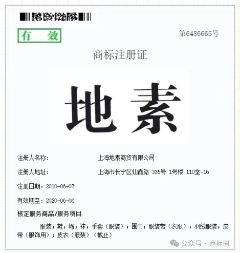 上海地素商贸有限公司,为第6486665号“地素”商标的所有权人,核定使用商品为第25类服装;鞋;帽;袜;手套(服装);围巾;服装带(衣服);羽绒服装;皮带(服饰用);皮衣(服装)。该公司同时为“DZZIT”“DAZZLE”“地素时尚”等注册商标的权利人。