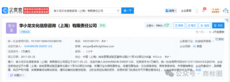 事情得从2010年说起,李小龙的女儿李香凝,为了维护父亲的形象和商标权益,陆续买回了李小龙影片及商标在美国的所有权,正式开启维权之路。到了2017年,李香凝在上海成立了李小龙文化信息咨询(上海)有限责任公司,准备在国内开展维权行动。