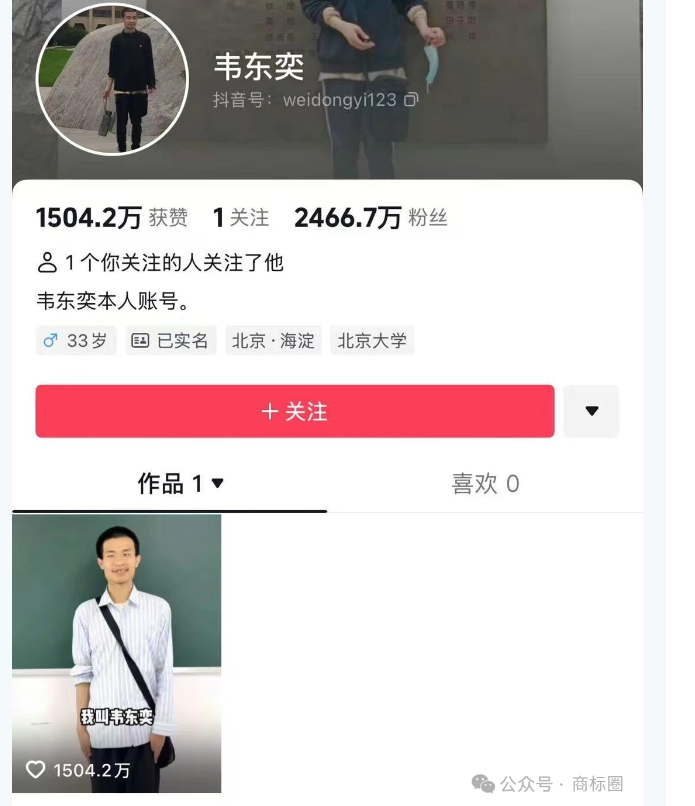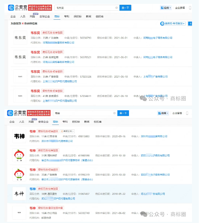 在“韦神热”中,商标抢注现象同样引人注目。有两家公司试图将“韦东奕”注册为商标,国际分类涉及教育娱乐、广告销售、服装鞋帽等。这些公司的行为,本质上是将韦东奕的个人名誉商品化,企图借助他的名气获取商业利益。这种商标抢注行为不仅违背了市场的公平竞争原则,也触碰了法律与道德的红线。