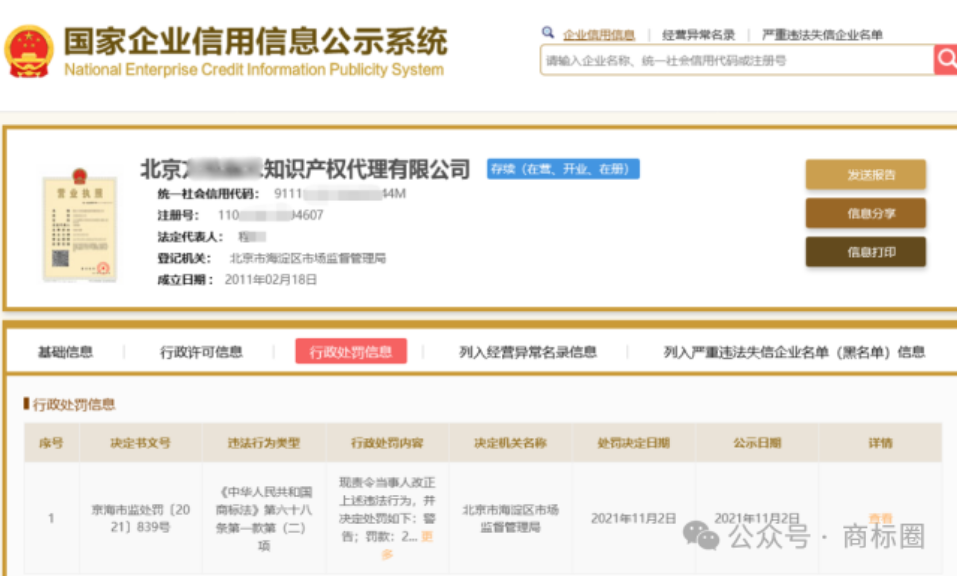 近日,国家企业信用信息公示系统发布了一则行政处罚信息。北京一知识产权代理有限公司在商标局官网未曾下发正式驳回通知的情况下就通知申请人其申请商标被驳回,涉嫌以不正当手段扰乱商标代理市场秩序。北京市海淀区市场监督管理局现责令该公司改正违法行为,并决定处罚如下:警告;罚款:20000元。