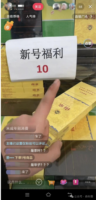 这种“挂羊头卖狗肉”的情况,在直播间里可不是个例。主播们含糊其辞,拿着所谓的“福利商品”,用“懂的都懂”“新号开播送福利”之类模棱两可的话术,疯狂暗示这就是大家熟知的名牌香烟,让消费者们在云里雾里中,不自觉地就被诱导下单。