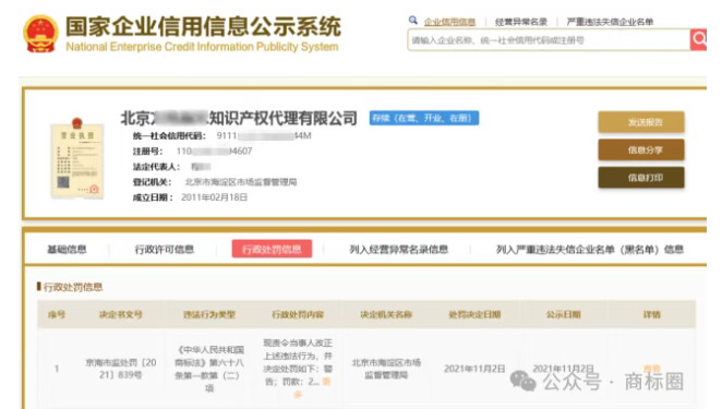 近日,国家企业信用信息公示系统发布了一则行政处罚信息。北京一知识产权代理有限公司在商标局官网未曾下发正式驳回通知的情况下就通知申请人其申请商标被驳回,涉嫌以不正当手段扰乱商标代理市场秩序。北京市海淀区市场监督管理局现责令该公司改正违法行为,并决定处罚如下:警告;罚款:20000元。