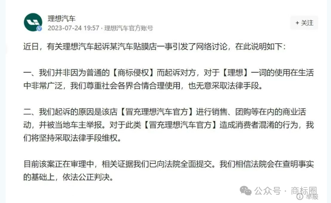 理想汽车认为,“理想汽车贴膜工厂”在店面门头、店内装潢以及社交平台宣传中使用“理想”标识,容易使消费者产生混淆,误以为该贴膜店与理想汽车存在某种关联,从而构成了对其商标权的侵害。同时,理想汽车指出该贴膜店的行为属于不正当竞争,损害了其品牌形象和市场利益。