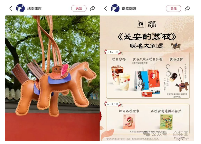 由于该剧播出时热度不断,该影视剧的联名IP也是层出不穷,其中最知名的就是与茶饮界的联名,比如瑞幸咖啡,《长安的荔枝》剧中出现的骑马送荔枝形象,被瑞幸设计成“马上荔枝”挂件,瑞幸更是特地为此次联名研发了新品“长安的荔枝冻冻”与“长安的荔枝冰萃”。