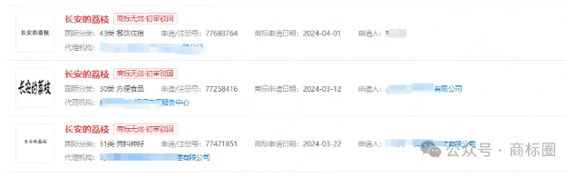 值得注意的是,在《长安的荔枝》制作方申请商标之后,竟然有市场主体提交了“长安的荔枝”商标注册申请,国际分类涵盖餐饮住宿、方便食品等,不过好在这些商标多数都已经在初审时被国家商标局驳回,目前是无效状态。