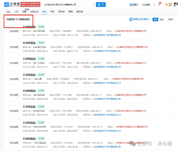 小编通过查询发现,《长安的荔枝》背后制作方的知识产权保护意识还是非常值得肯定的。该剧的制作方北京留白时代影视文化传播有限公司早在该剧上线之前,就已经注册了33枚“长安的荔枝”商标,其国际分类包括餐饮住宿、厨房洁具、教育娱乐等多个类别,目前均已注册成功。