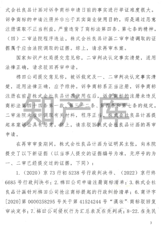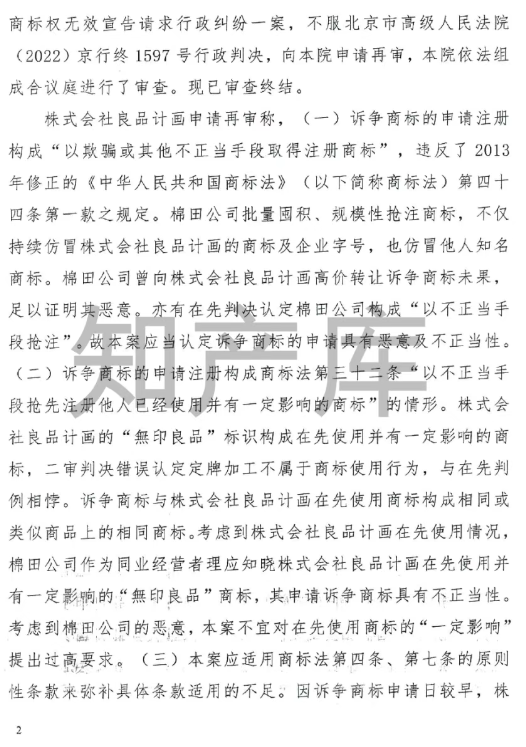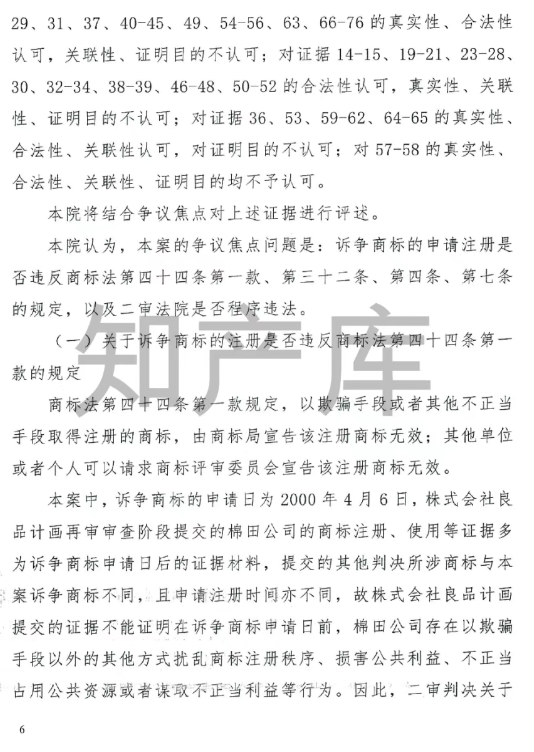 本案中,诉争商标的申请日为2000年4月6日,株式会社良品计画再审审查阶段提交的棉田公司的商标注册、使用等证据多为诉争商标申请日后的证据材料,提交的其他判决所涉商标与本案诉争商标不同,且申请注册时间亦不同,故株式会社良品计画提交的证据不能证明在诉争商标审请日前,棉田公司存在以欺骗手段以外的其他方式扰乱商标注册秩序、损害公共利益、不正当占用公共资源或者谋取不正当利益等行为。