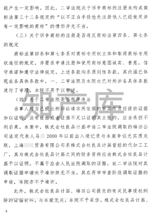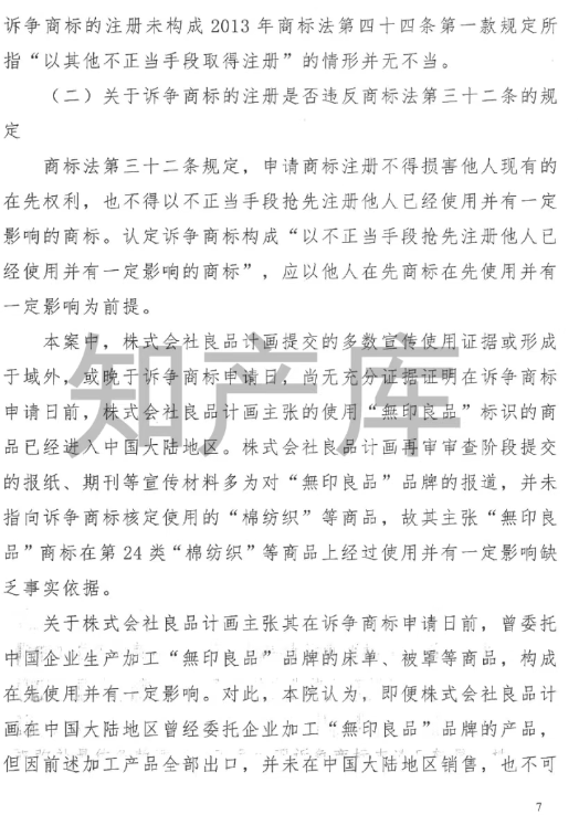 本案中,株式会社良品计画提交的多数宣传使用证据或形成于域外,或晚于诉争商标申请日,尚无充分证据证明在诉争商标申请日前,株式会社良品计画主张的使用“無印良品”标识的商品已经进入中国大陆地区。株式会社良品计画再审审查阶段提交的报纸、期刊等宣传材料多为对“無印良品”品牌的报道,并未指向诉争商标核定使用的“棉纺织”等商品,故其主张“無印良品”商标在第24类“棉纺织”等商品上经过使用并有一定影响缺乏事实依据。