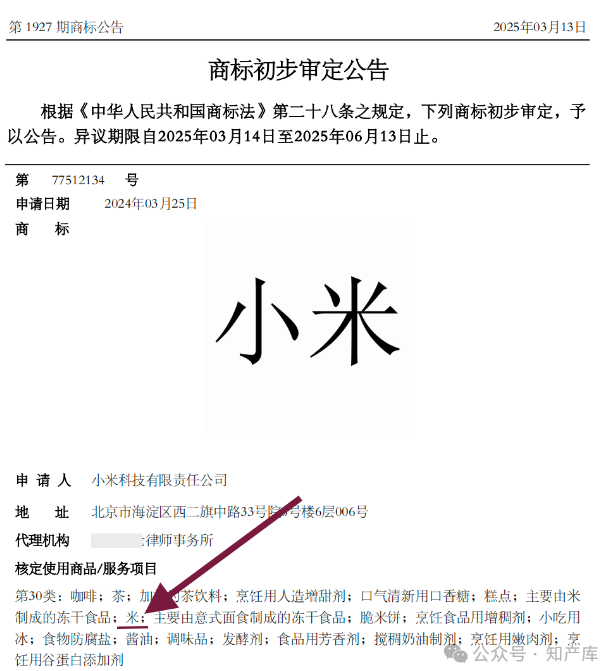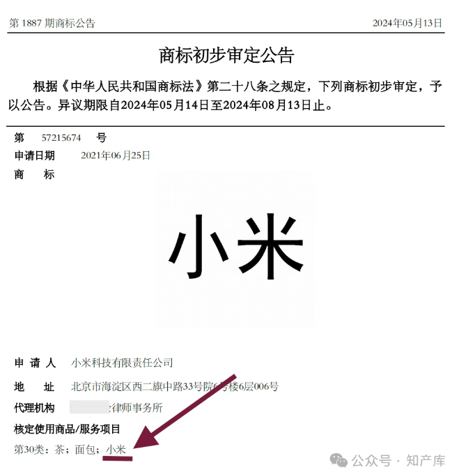 6月14日,一件“小米”商标核准注册,核定使用商品赫然包含了“米”。