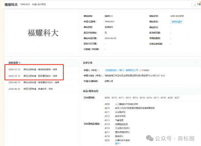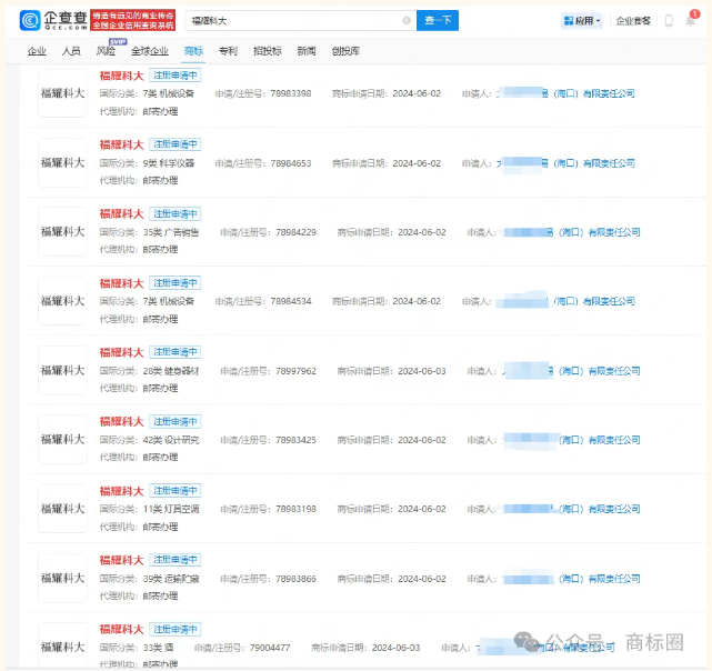据查询,海口某公司于2024年6月一口气申请了17个的“福耀科大”商标,涵盖教育娱乐、餐饮住宿、广告销售等多个领域。从商标状态来看,这些申请目前均处于“申请注册中”阶段,虽然其中大部分商标都被驳回,但这种行为无疑严重损害了福耀科技大学的合法权益,也在一定程度上影响了学校正常的品牌建设和发展规划。