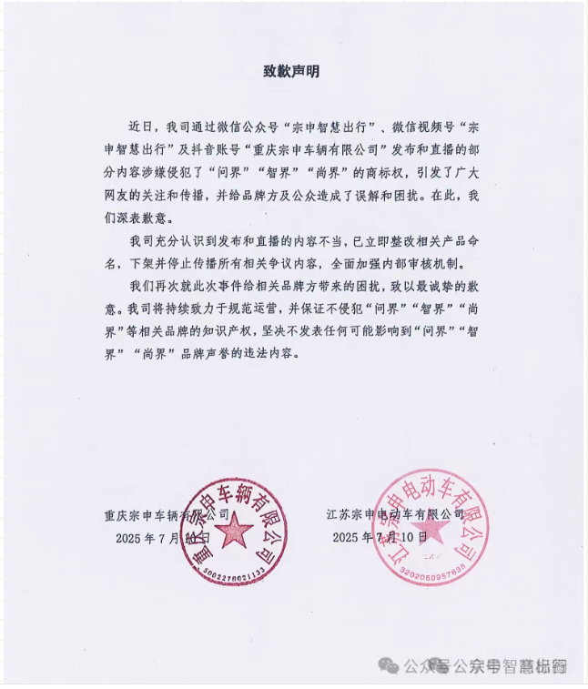 在铺天盖地的舆论压力下,宗申终于坐不住了。7月10日,“宗申智慧出行”微信公众号发布了一则致歉声明。