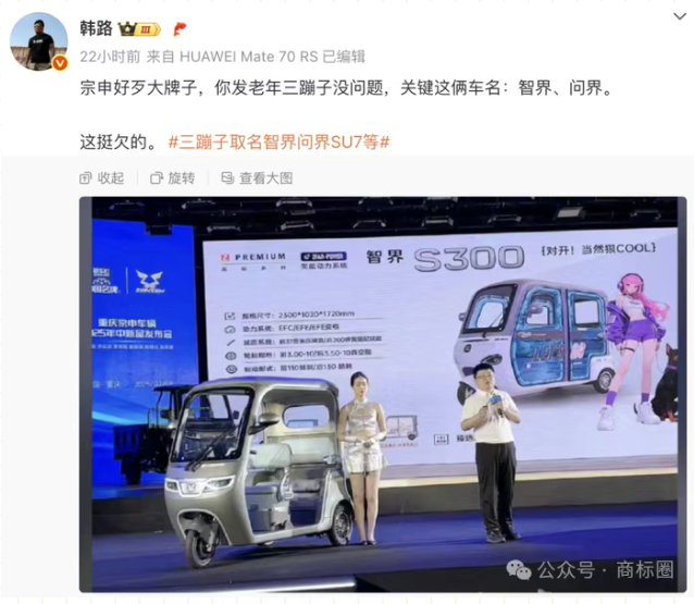 近期,某知名汽车博主在社交平台发布消息称:宗申品牌的两款三轮车产品,一款叫“问界Q1”,另一款叫“智界S300”。这消息一放出来,瞬间在网上炸开了锅!大家第一反应都是:这怕不是在“碰瓷”问界和智界汽车吧?毕竟问界、智界在汽车市场那热度相当高,粉丝众多。而宗申作为在三轮车领域摸爬滚打多年的品牌,这次的命名操作实在让人捉摸不透,也难怪网友们纷纷质疑。