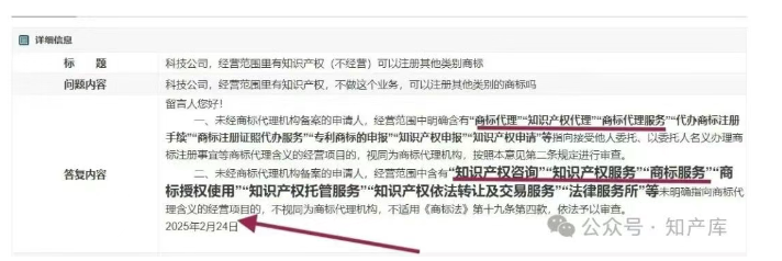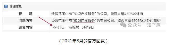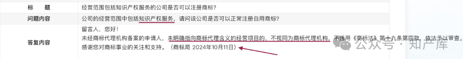 时间来到2024年,对于申请人经营范围中包括商标分类4506“知识产权服务”是否可以注册自用商标的提问,国知局的答复是: