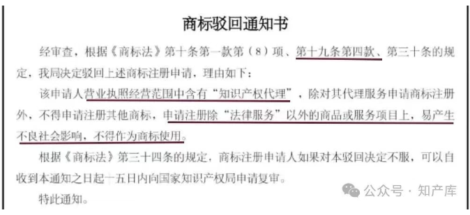 如果这些主体申请第45类4506之外的商标,会以违反我国《商标法》第19条4款的规定为由: