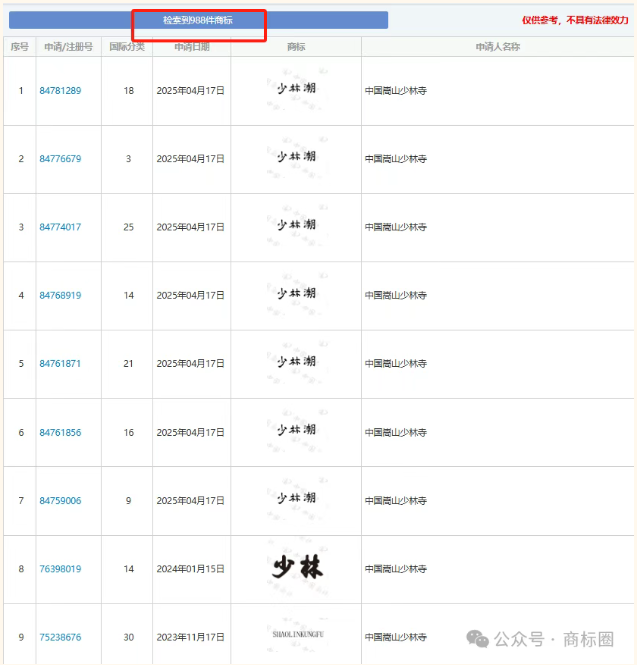 从1997年起至今,少林寺申请的商标多达900余枚,其数量之多令人咋舌。这些商标涵盖范围极广,像我们熟知的“少林”“少林寺”“少林功夫”等都在其中。而且,少林寺在商标注册时,有些甚至是全品类注册。要知道,商标注册时有45个类别可选,各类别下又有细分,这意味着少林寺的商标布局几乎渗透到了商业的各个角落。如此广泛的商标申请,充分体现了少林寺对品牌全方位保护的决心,也为其商业发展奠定了坚实的法律基础。