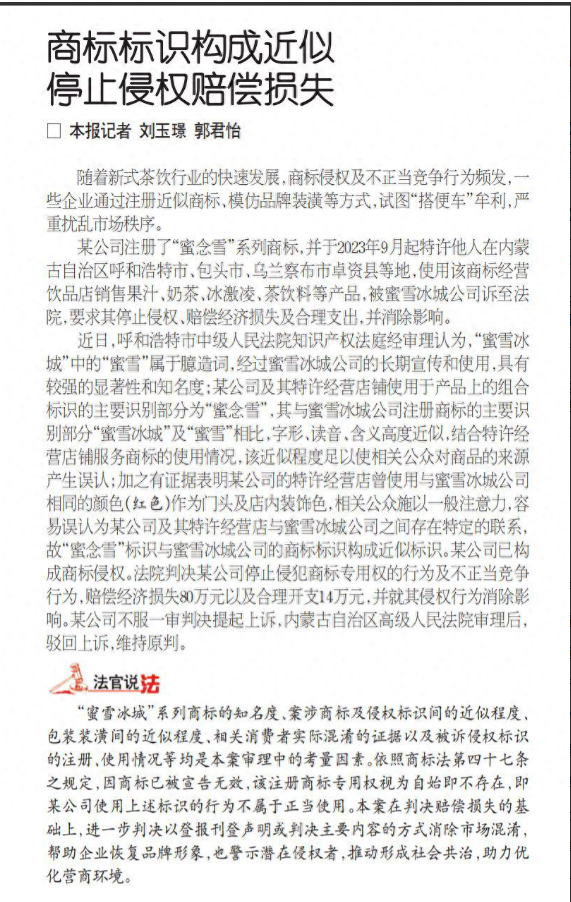 近日,呼和浩特市中级人民法院知识产权法庭经审理认为,“蜜雪冰城”中的“蜜雪”属于臆造词,经过蜜雪冰城公司的长期宣传和使用,具有较强的显著性和知名度;某公司及其特许经营店铺使用于产品上的组合标识的主要识别部分为“蜜念雪”,其与蜜雪冰城公司注册商标的主要识别部分“蜜雪冰城”及“蜜雪”相比,字形、读音、含义高度近似,结合特许经营店铺服务商标的使用情况,该近似程度足以使相关公众对商品的来源产生误认;加之有证据表明某公司的特许经营店曾使用与蜜雪冰城公司相同的颜色(红色)作为门头及店内装饰色,相关公众施以一般注意力,容易误认为某公司及其特许经营店与蜜雪冰城公司之间存在特定的联系,故“蜜念雪”标识与蜜雪冰城公司的商标标识构成近似标识。某公司已构成商标侵权。法院判决某公司停止侵犯商标专用权的行为及不正当竞争行为,赔偿经济损失80万元以及合理开支14万元,并就其侵权行为消除影响。某公司不服一审判决提起上诉,内蒙古自治区高级人民法院审理后,驳回上诉,维持原判。