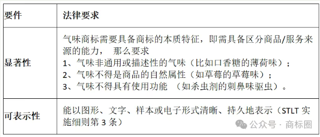 综合以上以及缔约方通常的法律规定,气味商标需满足三大法律要件: