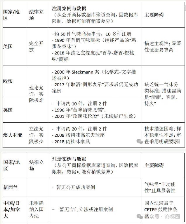 全球气味商标保护呈现不同接受程度区分态势,主要法域的制度特点如下:
