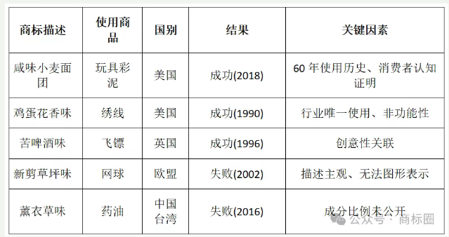 典型案例:试图注册“椰子味防晒霜”被拒,因气味掩盖化学成分异味属功能需求。