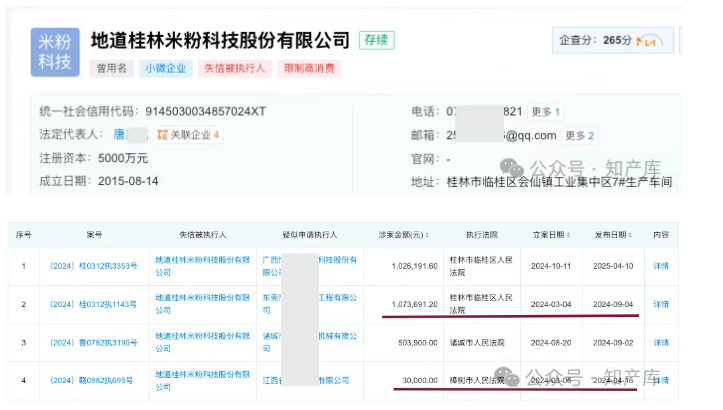 2024年3月,桂林米粉公司在两个案件中被列为失信被执行人,执行金额100万+。