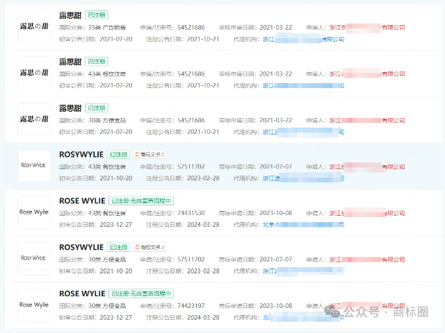 据查询,赵露思曾经的朋友徐某在明知“ROSYWYLIE”是赵露思原创并在先使用的情况下,仍恶意抢注。其申请注册的商标中,包含3件“露思の甜”、9件“ROSYWYLIE”商标,与赵露思关联密切,意图十分明显。