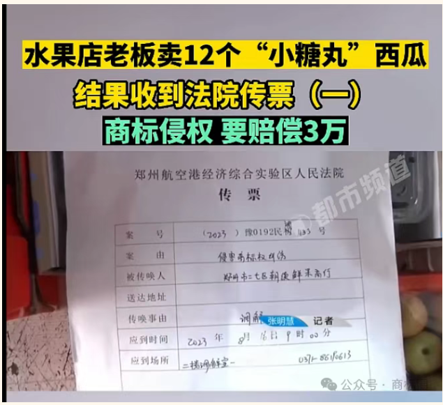 近期,郑州二七区一水果店的王先生,卖了12个“小糖丸”西瓜,却收到了法院的传票,说侵犯了商标权,要赔偿3万元。