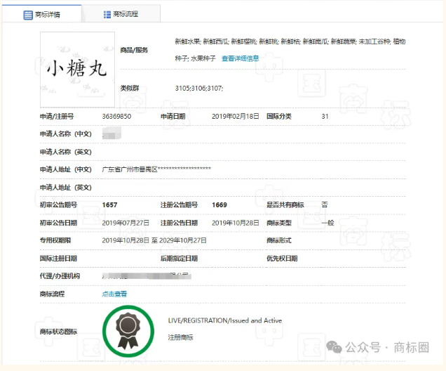 商标的有效期是2019年10月-2029年10月,目前商标在有效期,注册保护范围包含新鲜水果,新鲜西瓜。