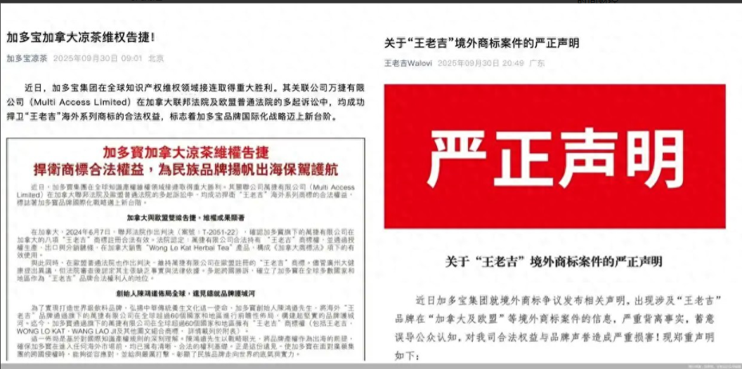加多宝在文章中提到在加拿大和欧盟等国家或地区诉讼的结果,“在加拿大,2024年6月7日,联邦法院作出判决(案号:T-2051-22),确认加多宝旗下的万捷有限公司在加拿大的八项‘王老吉’商标注册合法有效。法院认定:万捷有限公司合法持有‘王老吉’商标权,并通过授权生产、出口与分销链条,在加拿大销售‘Wong Lo Kat Herbal Tea’产品,构成《加拿大商标法》项下的有效使用。与此同时,在欧盟普通法院也作出判决,维持万捷有限公司在欧盟注册的‘王老吉’商标。尽管广州大健康提出异议,但法院审查后认定其主张缺乏事实与法律依据”。