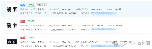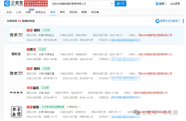 除了魏家凉皮外,西安华荣魏家餐饮管理有限公司还针对“魏家”品牌延伸出的多元化子业务,如魏家便利、魏客咖啡、魏斯理汉堡等,均进行了全面的商标预注册。这种对近似商标的提前布局,有效防止了竞争对手通过近似商标搭便车的行为。