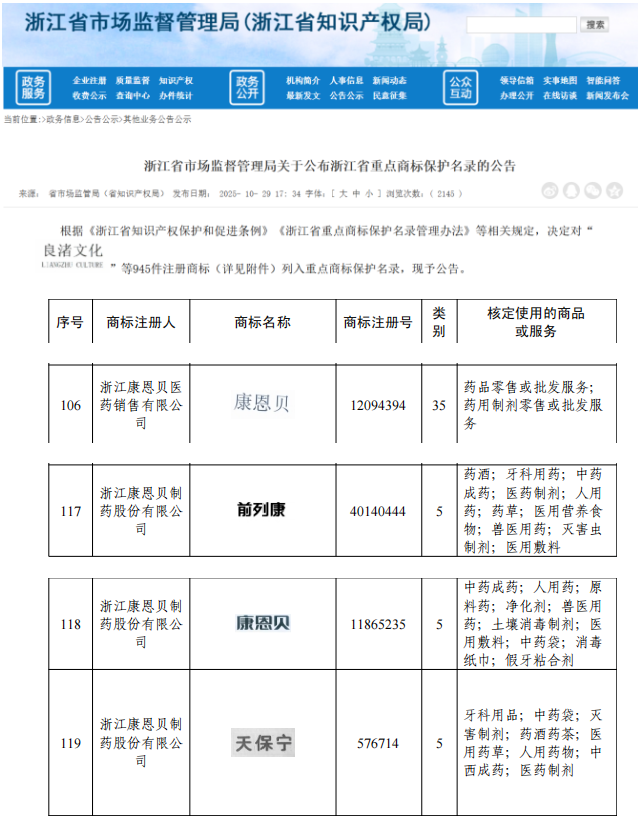 近日,浙江省市场监督管理局公布《浙江省重点商标保护名录》,康恩贝(600572)共有9大核心商标成功入选。其中包括“康恩贝”核心主品牌商标(两大类别),以及“前列康”“天保宁”“至心砃”“金艾康”“金笛”“贝贝”“宝芝林”等7个在细分领域的产品品牌商标。