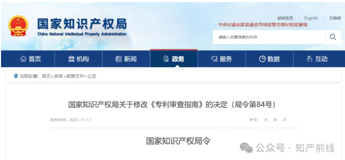 《国家知识产权局关于修改〈专利审查指南〉的决定》已经2025年9月18日第5次局务会议审议通过,现予公布,自2026年1月1日起施行。