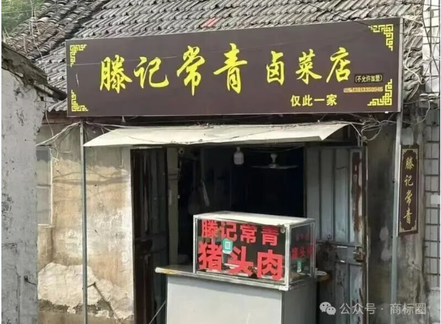 故事的另一方正是腾某妻子的妹妹常某,早年在卤肉店里帮忙。2009年,常某决定单干,在常记卤菜店附近开了家店。2022年,她申请注册了“滕记常青”商标,并将店铺招牌也换成了“滕记常青卤菜店”,不过玻璃橱窗上还保留着“老字号猪头肉”的字样。