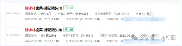 与此同时,滕某的女儿也在2021和2022年分别注册了“滕永林卤菜—滕记猪头肉”商标,并在同一个的街道上开了新店,门头还特意突出“非遗传承老字号”的标识。从此,两家都带着“滕记”标识的卤菜店开始默默较劲。