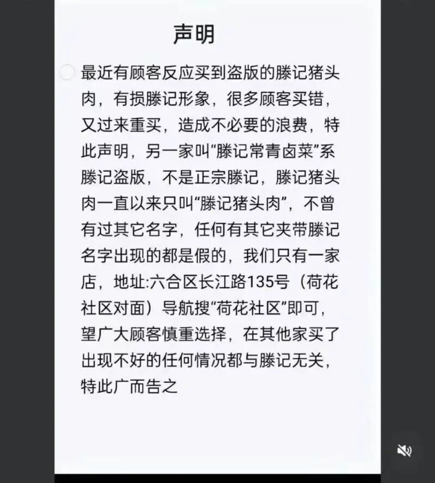 2023年,矛盾突然爆发。腾某女儿的卤菜店在抖音账号上发表声明视频称:“另一家叫滕记常青卤菜,系滕记盗版!”还在视频里配文吐槽:“附近有一家冒牌的,在一个破房子里,环境脏乱差,已有多人受骗。”与此同时,店铺门头的LED屏幕上也循环播放着:“另一家滕记常青是滕记盗版,如有问题与滕记无关。”