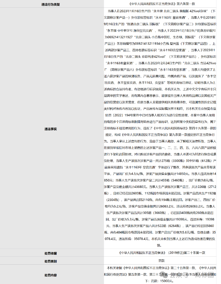 据北京二锅头的相关处罚决定书显示:其在产品外包装上赫然印着“永丰1163年皇宫贡酒”“永丰牌中华老字号源自皇宫贡酒”等字样,却无法提供连续、可追溯的历史记载材料予以印证,被认定构成虚假宣传行为,依法处以1.5万元罚款。相关部门认为,尽管当事人已注册“永丰皇宫贡酒”“永丰皇家贡酒”“永丰1163”等商标,但其将持有的多件商标重新排列组合用于产品标识,导致产品宣传与客观事实不符,易使消费者对商品来源、品质和历史渊源产生误解,属于注册商标的不规范使用,构成不正当竞争。