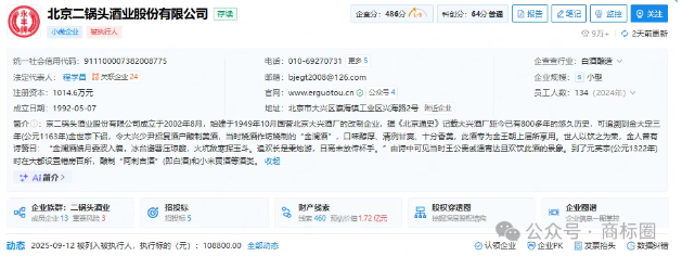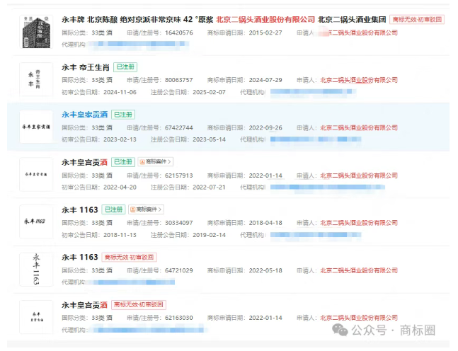 作为一家老牌酒企,北京二锅头名下的已注册的商标也不在少数,其中包括“永丰1163年”“源自皇宫贡酒”等。