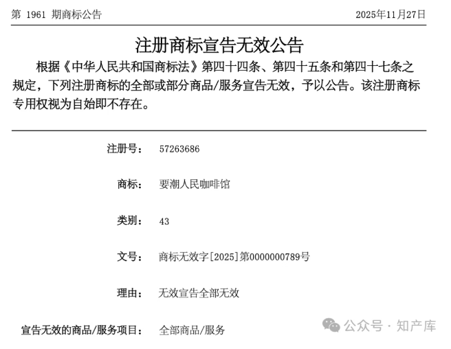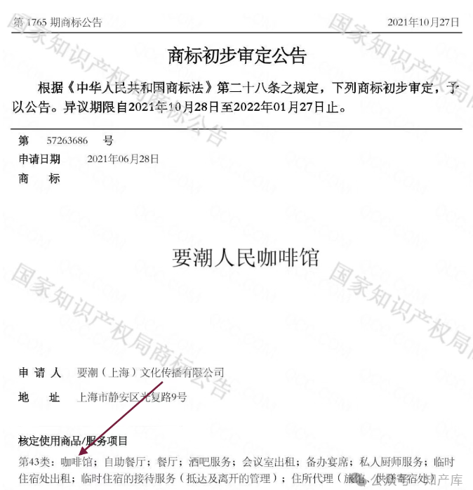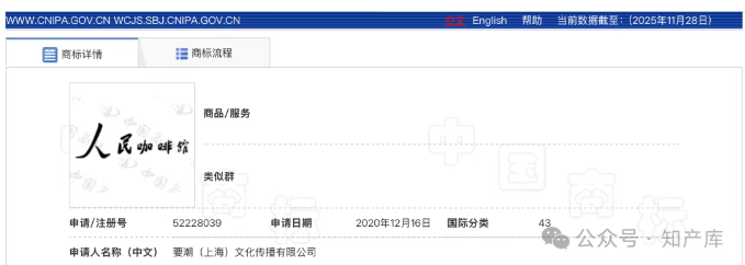 以要潮公司2020年12月申请的第30、43类52228039号“人民咖啡馆”为例: