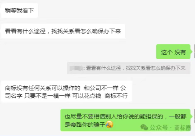 前段时间小编就遇到一个客户,非说有个代理联系他,有硬手段可以让他商标下证,只需要准备好钱就行。当时我跟客户讲了下他驳回的原因,以及通过的概率,并解释了这种所谓关系百分百的一般都是套路人的骗子,让客户提高警惕。