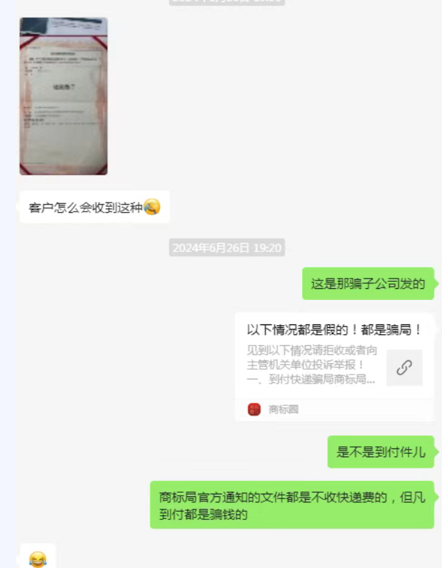 很多客户总是收到一些到付快递,说是商标局文件,客户担心自己漏掉什么关于自己商标的信息,通常会选择付款签收。殊不知打开快递,里面可能只是一个纸质的受理通知书或者初审公告通知书,没有什么价值。纯纯是骗子为了骗快递费。在此也教给大家一个最实用也最简单的防骗小技巧,就是商标局是不会邮寄任何到付快递件的,所以只要自称是商标局邮寄过来的到付件,一律拒收即可。